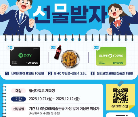 도서관은 러닝365학습관 외에도 학습과 연구를 지원하는 다양한 서비스를 제공하고 있다. 논학위논문을 체계적으로 관리하는 dCollection, 구독 학술 DB, 전자저널, 웹DB 등 전자정보 자원 이용이 대표적이다. 또한 필요한 자료를 직접 신청할 수 있는 희망 도서 제도와 전자책 서비스, 학술DB 검색법과 도서관 이용법을 배우는 온라인 이용 교육·독서역량 진단 교육 등도 제공하고 있다. RISS, ScienceON, 외국학술지지원센터(FRIC) 등 외부 학술기관과의 연계를 통해 보다 다양한 자료 접근도 가능하다. 도서관은 이번 이벤트를 계기로 학습 지원 서비스를 더욱 고도화할 계획이다. 정기적인 만족도 조사와 의견 수렴을 통해 시설·운영상의 불편을 개선하고, 이용자 중심의 도서관으로 자리매김하겠다는 목표이다.