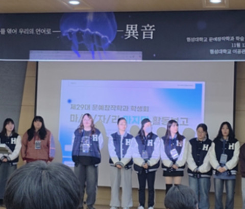 ▲ 문예창작학과 29대 학생회 마/음/자/리   문예창작학과의 학술세미나가 11월 12일부터 13일까지 이공관 304호에서 열렸다. 이번 세미나는 제29대 문예창작학과 학생회 마/음/자/리가 준비한 학과 대표 행사로, 전 학년이 함께 모여 서로의 활동을 공유하고, 게임 프로그램과 초청 강연을 통해 화합과 배움이 동시에 이루어지는 자리였다. ‘이야기가 마음을 잇는 시간’이라는 행사 슬로건처럼, 이틀 동안 다양한 활동이 이어지며 문창과 구성원 모두가 하나의 흐름 안에서 연결되는 순간이 만들어졌다. 첫째 날인 12일에는 다 함께 참여하는 게임 프로그램 ‘스파이를 찾아라!: 스파이폴’로 시작됐다. 학년 구분 없이 섞인 조 편성 덕분에 소통하는 분위기가 만들어졌다. 이어 동아리 발표 시간에는 소설 학회 ‘담음’과 시 동아리 ‘협성문학회’가 무대에 올라 그동안 준비해온 창작 활동을 공유했다. 올해 주요 활동과 동아리 홍보를 통해 전공 특유의 창작 열정을 확인할 수 있는 시간이었다. 1부 활동이 끝난 뒤에는 미니게임인 프러포즈 게임으로 학우들이 적극 참여할 수 있도록 진행됐다. 후에 이정은 웹소설 작가가 초청 강연자로 무대에 올랐다. 현장에서 활동하는 작가의 생생한 경험을 듣고 웹소설 시장의 구조, 작가로서의 창작 루틴, 산업의 흐름까지 세밀하게 들을 수 있는 시간이었다. 학우들은 실제 웹소설 플랫폼에서 일어나는 제작 과정과 트렌드에 대해 적극적으로 질문하며 진로에 관한 현실적인 조언을 얻기도 했다. 이후 학생회가 준비한 연간 활동 보고를 끝으로 첫째 날의 일정이 마무리되었다. 둘째 날에는 ‘바다거북스프’ 게임으로 시작했다. 협업이 중요한 게임인 만큼 학우들이 자연스럽게 의견을 나누고 웃음을 주고받으며 분위기가 한층 더 부드러워졌다. 오전 동아리 발표는 편집동아리 ‘퓨즈’가 맡아 진행했다. 평소 문학 잡지와 학과 콘텐츠 제작을 담당하는 동아리답게, 발행 과정과 기획 의도, 실제 편집 실무 경험까지 폭넓게 공유해 학생들의 관심을 끌었다. 이날의 초청 강연자로는 문예창작학과를 졸업한 박민경 작가가 자리했다. 박민경 작가는 우리대학 문예창작학과 07학번 졸업생이다. 순문학 작품 활동뿐 아니라 카피라이터로서의 경험까지 아우르는 이야기가 전해지며, 동시에 두 영역을 어떻게 병행할 수 있는지에 대한 현실적인 조언이 이어졌다. 문학을 전공한 학우들이 선택할 수 있는 진로의 폭이 생각보다 넓다는 점을 확인할 수 있는 자리였다. 강연 후에는 ‘스무고개’ 게임으로 분위기가 다시 경쾌하게 돌아왔고, 마지막에는 경품 추첨 이벤트까지 진행되어 학우들의 호응이 이어졌다. 이번 학술세미나는 단순한 프로그램을 넘어, 학과 구성원 모두가 함께 웃고 배우며 서로의 세계를 확인하는 시간이 되었다. 게임으로 시작해 강연으로 확장되는 일정 구성은 전공 특성에 맞춘 ‘사유와 창작의 시간’이었고, 동아리 발표는 학년 간의 교류를 더욱 탄탄히 다졌다. 무엇보다 두 명의 현업 작가가 들려준 현실적인 이야기들은 문학의 길을 고민하는 학우들에게 큰 영감을 주었다. 이번 학술세미나는 서로의 이름을 더 오래 기억하게 하고, 앞으로의 길을 한 걸음 더 단단하게 만들었다. 문예창작학과 학우들은 이틀 동안 이어진 마/음/자/리의 노력과 따뜻한 분위기 속에서 또 하나의 ‘이야기를 잇는 시간’을 만들었고, 앞으로 이어질 창작의 여정에 새로운 에너지를 더했다.